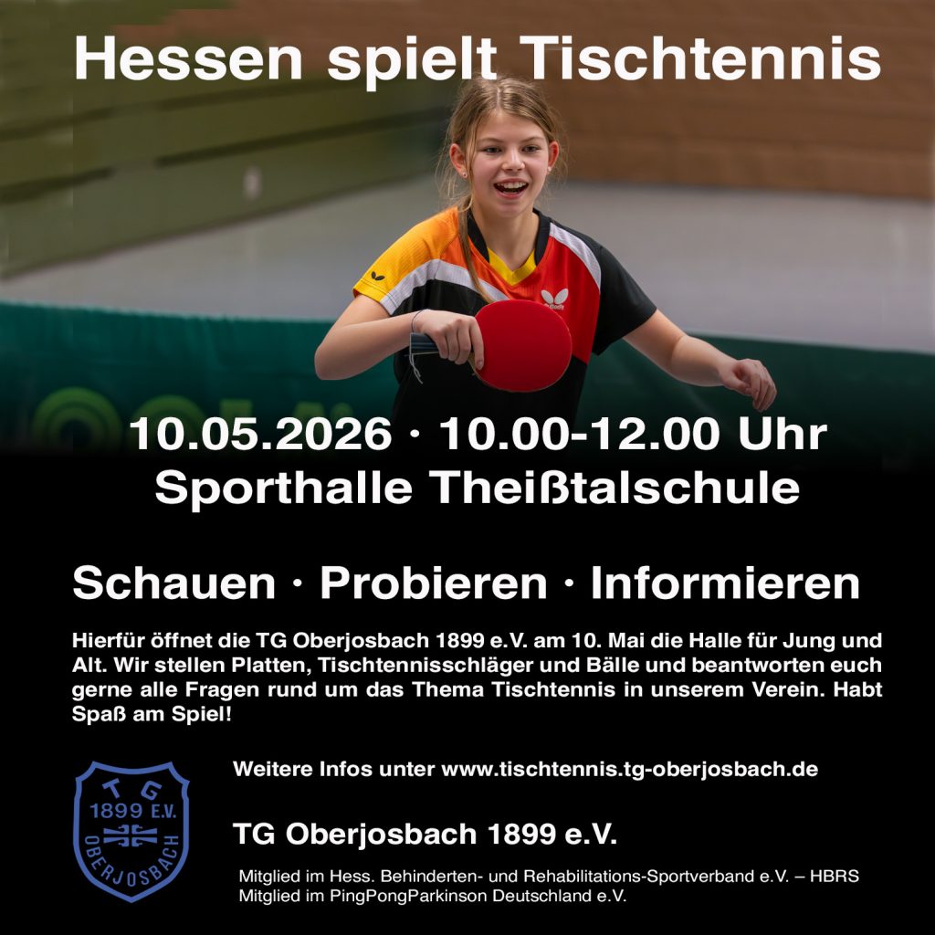 Die TG Oberjosbach sucht immer neue Tischtennisinteressierte, die ihre Mannschaften bereichern möchten. Herzlich willkommen sind auch alle Interessierten, die ganz neu oder nach einer Pause wieder Tischtennis spielen möchten.